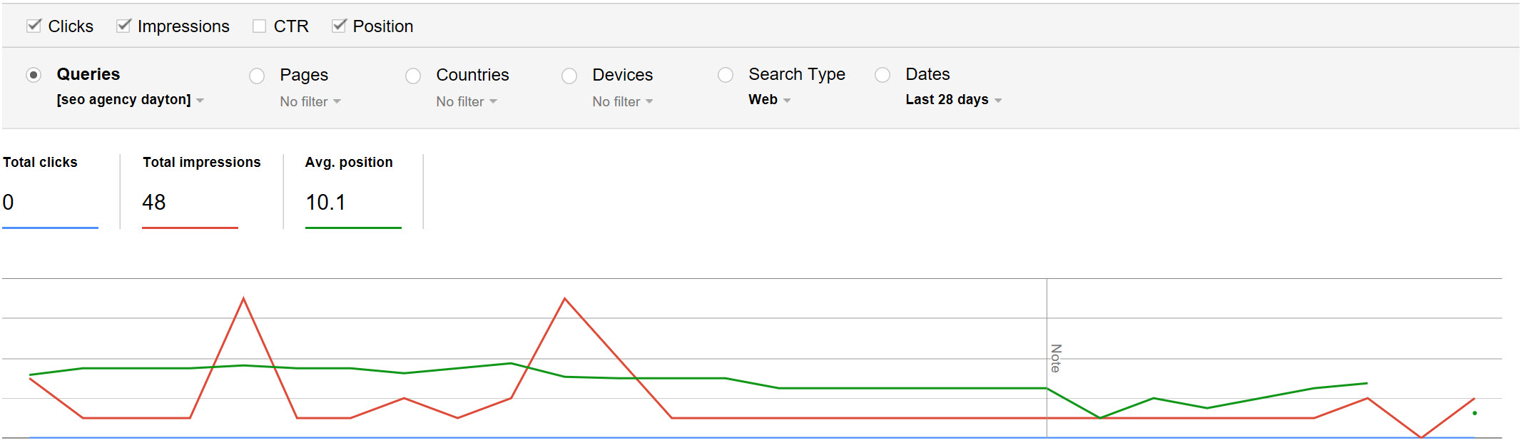 We help each of our clients establish and use Google accounts to determine SEO strategy all the time. One of the most overlooked AND most useful is Google Webmaster tools. We use Webmaster Tools to pick off keywords that need a boost. In my case: "SEO Agency Dayton Ohio" showed up according to webmaster tools as a second page result.